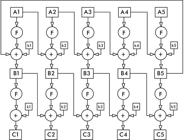 Байты A1—A5 являются входом функции искажения, в них подставляются байты ключа который шифруется. Байты С1—С5 это выход функции. Байты B1—B5 — промежуточные значения. Байты k1—k5 это байты общего выхода регистров сдвига в соответствующем режиме. Регистры сдвига изначально заполняются ключом, с помощью которого происходит шифрование. Символом F обозначена взаимнооднозначная замена байта по таблице. Плюс обозначает побитовое сложение байтов. Выход функции искажения является шифрованным ключом.[1]