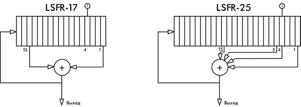 - Регистры сдвига проходят восемь тактов и каждый выдаёт выходной байт. В качестве обратной связи в регистрах сдвига используется функция «Исключающее Или». В случае 17-битного регистра на вход её подаются биты 1 и 15, а выход подаётся на бит 17 и является выходом регистра сдвига. В случае 25-битного регистра на вход функции подаются биты 1, 4, 5 и 15, а выход подаётся на бит 25 и на выход регистра.[4]