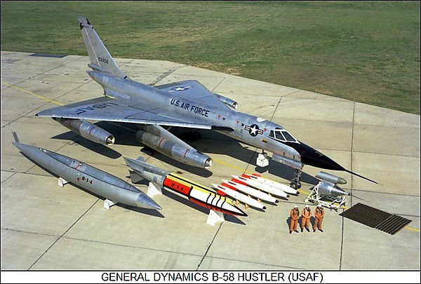 Конвэр B-58 «Хаслер»[2] (англ. Convair B-58 Hustler) — первый в мире сверхзвуковой дальний бомбардировщик, состоявший на вооружении Стратегического командования ВВС США в 1960-е годы. На момент своего создания по максимальной скорости (M=2) не уступал самым скоростным истребителям. Конструкция бомбардировщика основана на использовании треугольного крыла, освоенного фирмой Convair при создании истребителей (F-102), и четырёх двигателей J79, на подкрыльевых пилонах. Носитель пяти термоядерных бомб, четырёх на пилонах в корневых частях крыла и одну в комбинированном топливно-бомбовом контейнере под фюзеляжем.