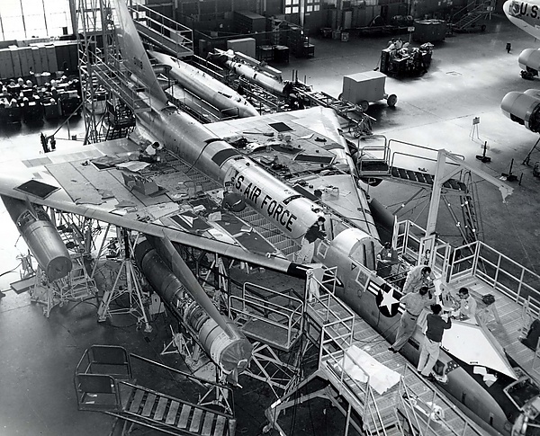 Первоначально планировали установку двигателей в спаренных гондолах (как на В-47 и В-52) для снижения массы конструкции (примерно на 450 кг) и облегчения доступа к двигателям при техобслуживании. Однако испытания показали, что сопротивление такой конфигурации на трансзвуковых скоростях почти вдвое превышало расчётное и не позволяло выйти на сверхзвук. Размещение же турбин в отдельных гондолах соответствовало правилу площадей, сформулированному летом 1952 года сотрудником NACA Р. Уиткомбом, и уменьшало лобовое сопротивление, особенно в конфигурации с подвесным контейнером.