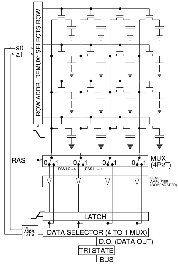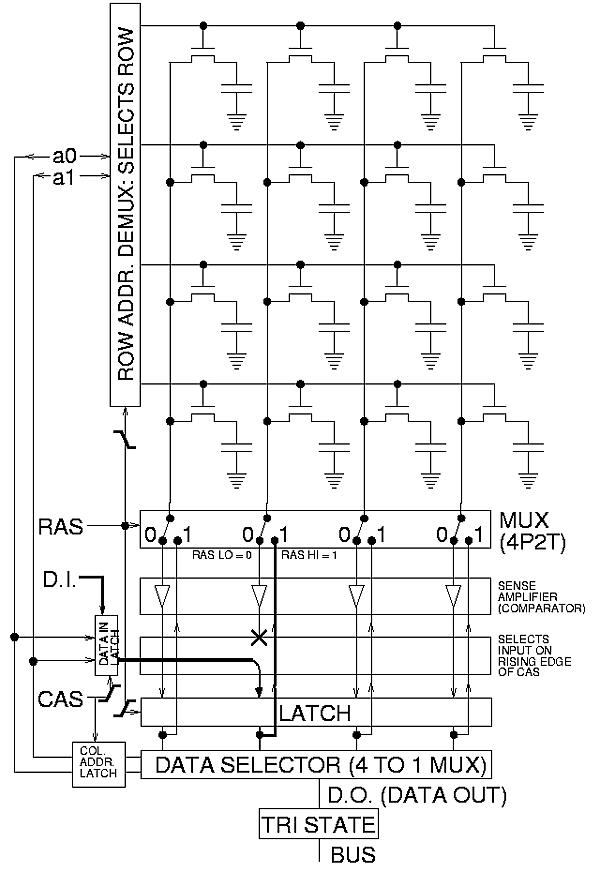 Важным элементом памяти типа DRAM является чувствительный усилитель-компаратор (англ. sense amp), подключённый к каждому из столбцов «прямоугольника». При чтении данных из памяти усилитель-компаратор реагирует на слабый поток электронов, устремившихся через открытые транзисторы с обкладок конденсаторов, и считывает одну строку целиком. Чтение и запись выполняются построчно; обмен данными с отдельно взятой ячейкой невозможен.