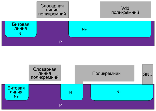 На физическом уровне память DRAM представляет собой набор ячеек, способных хранить информацию. Ячейки состоят из конденсаторов и транзисторов, расположенных внутри полупроводниковых микросхем памяти[8]. Конденсаторы заряжают при записи в ячейку единичного бита и разряжают при записи в ячейку нулевого бита.