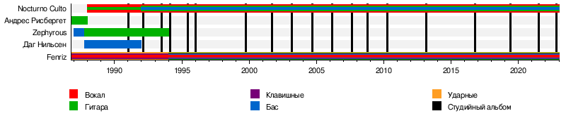 Darkthrone — дуэт из Fenriz'а и Nocturno Culto с тех пор, как гитарист Zephyrous покинул группу в 1993 году. Они стремились оставаться вне музыкального мейнстрима. С 2006 года их музыка отошла от традиционного стиля блэк-метал и с 2006 года включала в себе больше элементов традиционного хэви-метала, панка и спид-метала, в то время как более поздние альбомы также включали дум-метал[9].