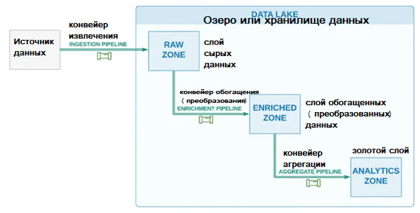 - информационные озёра — хранилища, содержащие необработанные данные в их первоначальном виде и формате;