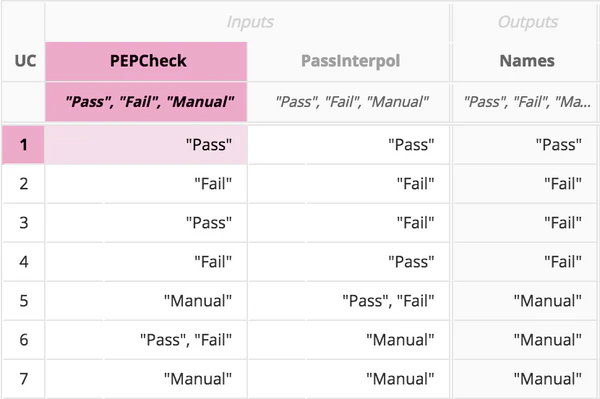 Проверки по PEP и Interpol реализованы как «нечёткие» сопоставления с подсчётом рейтинга совпадения. Значения рейтинга выше 85 считаются «совпадением», от 65 до 85 требуют ручной проверки. Если результат от 65 до 85 — решение переводится в ручной режим, и менеджер самостоятельно перепроверяет заявку. Эти правила отражены в следующей таблице решений: