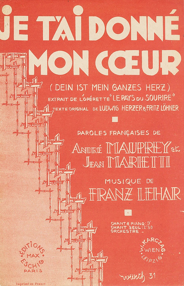 «Страна улыбок» стала авторской переработкой оперетты «Жёлтая кофта» (либретто Виктора Леона), поставленной в 1923 году в венском театре «Ан дер Вин» и не имевшей широкого успеха. Одной из причин возвращения Легара к его ранней работе на сюжет из китайской жизни стала болезнь певца — в начале 1929 года Таубер заболел ревматизмом и думал о завершении сценической карьеры. Костюм китайского принца Су-Хонга — широкое кимоно с длинными рукавами — позволял скрыть хромоту и затруднённость движений артиста[3]. Новый текст оперетты был написан либреттистами Людвигом Герцером и Фрицем Лёнер-Бедой. Коронная «тауберовская песня» появилась при участии самого певца — просмотрев ноты, Таубер выбрал вскользь проходившую в «Жёлтой кофте» тему, которая была разработана Легаром и стала мелодией арии героя. Композитор написал на нотном листе: «Милый Рихард! Вот тебе твоя „тауберлид“!!» Дарственная надпись датирована 17 августа 1929 года[3][4][5].