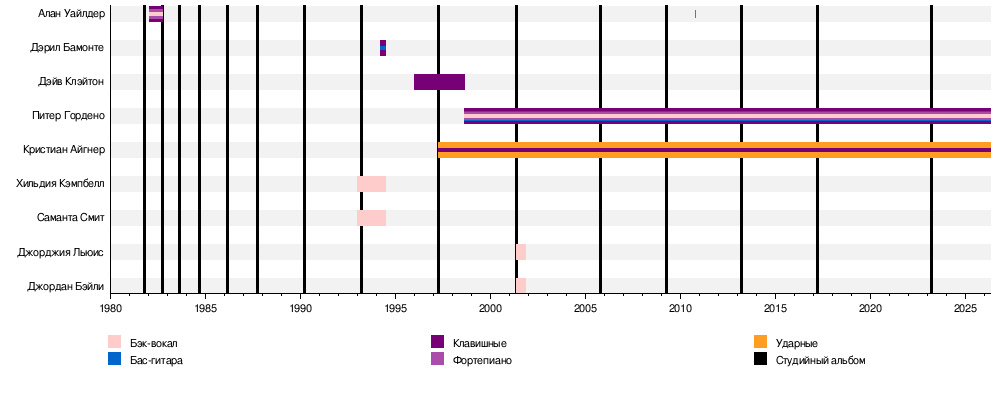- Алан Уайлдер — клавишные, фортепиано, ударные, бэк-вокал (1982—1995; концертный участник в 1982, 2010)