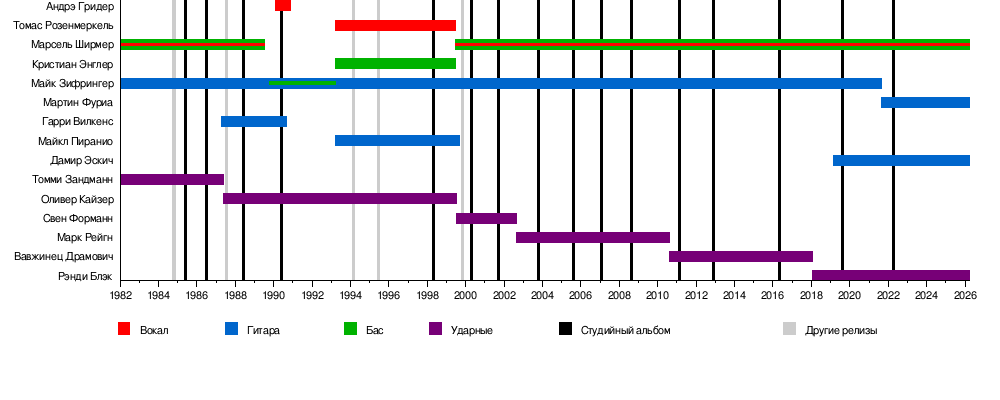 - Марсель «Schmier» Ширмер — вокал, бас-гитара (1982—1989, 1999—наши дни)