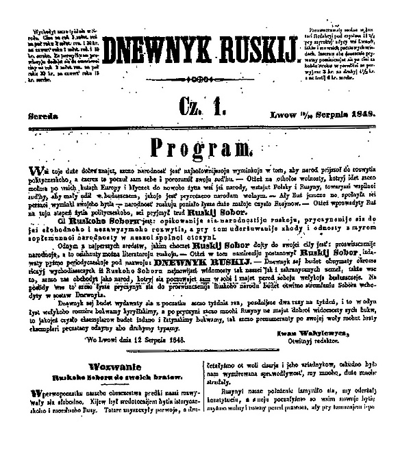 Положительная оценка газетой также давалась гетманам Мазепе и Выговскому. Таким образом, «Dnewnyk Ruskij» распространял историческую концепцию, легшую впоследствии в основу идеологии украинского национализма.[5]