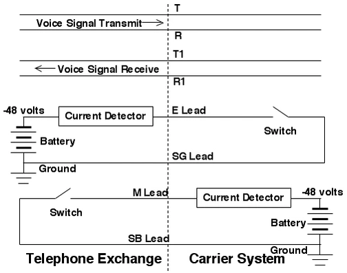 - SB, англ. signal battery — используется в некоторых типах интерфейса E&M; иногда −48 В, иногда земля, иногда не используется вовсе;