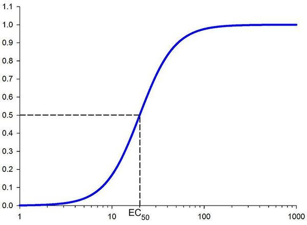 EC50 градуированной кривой концентрация-эффект, таким образом, представляет концентрацию соединения, при воздействии которой наблюдается эффект, равный половине его максимального эффекта[2]; EC50 квантованной кривой доза-эффект представляет концентрацию соединения, что вызывает ожидаемый эффект у 50 % особей подопытной популяции[3].