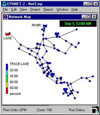 Возможности EPANET по моделированию качества воды позволяют анализировать перемещение реагирующих и не реагирующих меток (трассеров) по сети, отслеживая распределение вещества, измеряя процент потока из заданных узлов. Задействуется глобальный коэффициент реакции, который может настраиваться для каждой трубы отдельно. Резервуары могут моделироваться как идеально смешанные, проточные или двухкамерные реакторы.