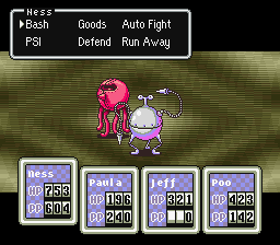 У каждого героя появляется своя особенность, например, Пола обладает способностью молиться, что приводит к абсолютно случайным эффектам, Пу может копировать способности и тактику противника в бою, а Джефф проверяет его характеристики и использует разнообразные технические приспособления. У каждого персонажа и у каждого противника есть очки здоровья, которые уменьшаются при получении урона. Если у всех героев они закончатся, то игра будет считаться проигранной, и игроку придётся начать снова перед битвой. Очки здоровья имеют своеобразную механику убывания — если персонаж получает урон, то очки здоровья вычитаются не сразу, а постепенно в режиме реального времени, отображённые на счётчике, похожем на одометр, при том, что битвы сами по себе пошаговые. Благодаря этому игрок получает возможность быстро вылечить героя с помощью предметов или пси-способностей, пока очки здоровья опускаются. Поскольку бои не начинаются из-за случайных встреч, разработчики добавили возможностей к тактическим манёврам. Если отряд персонажей подошёл к противнику сзади, у них появляется возможность нанести удар первыми. С другой стороны, если противник подошёл сзади к отряду героев, то первым удар нанесёт именно он. Если Несс и его друзья становятся чересчур сильными для противников данной местности, то они побеждаются без боя, стоит только игроку подвести отряд героев к врагу. При большой разнице в силе между врагами и отрядом героев враги начинают спасаться бегством, а не нападать на него, и игрок при желании может их догнать и перебить[11].