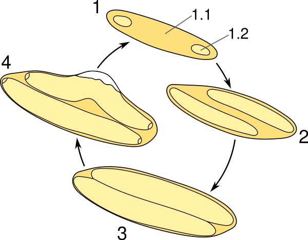 При делении у E. fishelsoni происходит внутреннее образование двух (реже более) дочерних клеток. Их рост начинается от концов материнской клетки и продолжается до тех пор, пока они не достигнут её длины. Далее зрелые дочерние клетки выходят из клеточной оболочки материнской клетки, сбрасывая её, как пустую шелуху. Подобным образом делится и близкородственная бактерия Metabacterium polyspora[2]. При формировании дочерних клеток деконденсированная ДНК, случайно расположенная в клетке, уплотняется обратно и формирует апикальные шапочки конденсированной ДНК. ДНК разделяется между дочерними клетками почти поровну[7].