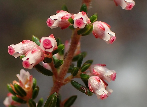Это прямостоячий кустарник, цветущий с декабря по апрель.У него множество мелких (2 мм) красновато-розовых цветков с чашевидными венчиками.