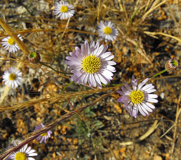 Cineraria canescens Spreng. Diplopappus occidentalis Hook. & Arn. Erigeron brazoensis Buckley Erigeron canescens Hook. & Arn. Erigeron decumbens Benth. 1849 not Nutt. 1840 Erigeron douglasii Torr. & A.Gray Erigeron fragilis Greene Erigeron nuttallii A.Heller Erigeron quercifolius DC. Erigeron setchellii Jeps. Erigeron stenophyllus Nutt. 1847 not Hook. & Arn. 1836 Erigeron striatus Greene Erigeron tenuissimus Greene Erigeron confinis Howell, syn of var. confinis Erigeron blasdalei Greene, syn of var. hartwegii Erigeron hartwegii Greene, syn of var. hartwegii Erigeron mendocinus Greene, syn of var. mendocinus |