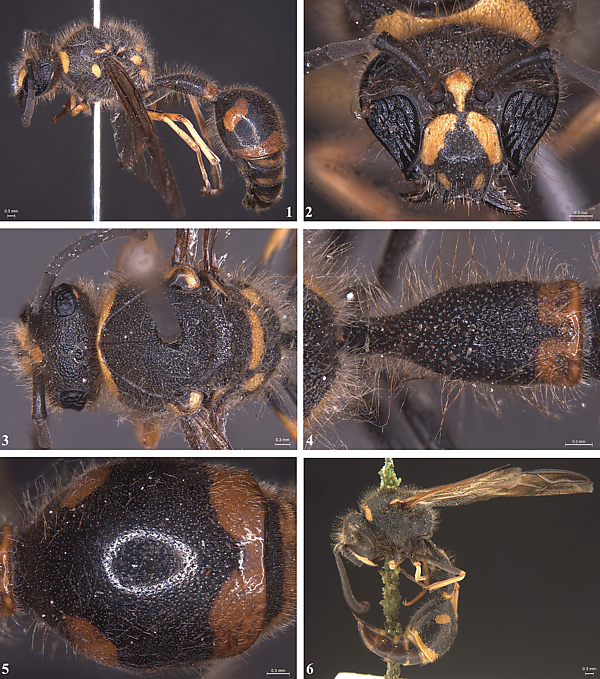 Желтовато-чёрные осы с тонким длинным стебельком брюшка (петиоль). Длина самок 12-13 мм. Стернит S2 с множеством беловатых волосков, примерно такой же длины, как на тергите Т2; пунктуры на Т2 очень мелкие и редкие, промежутки значительно больше диаметра точек; Т1 нормальной длины (3 мм), постпетиолюс резко и сильно расширен (грушевидный); висок с волосками; наличник в редкой пунктировке средней толщины; голова, мезосома, Т1 и Т2 в длинных беловатых волосках. Тело чёрное с жёлтыми отметинами. Желтый цвет имеют: прерывистая (иногда целая) отметина у основания наличника, распространяющаяся на боковые стороны, и два небольших пятна на вершине (иногда отсутствуют); линейная отметина межусикового пространства, касающаяся наличника; небольшая линейная отметина на виске по направлению к макушке; широкая полоса на переднеспинке; пятно на мезэпистернуме; заднеспинка; одно верхнее округлое пятно и одно нижнее удлиненное боковое пятно на проподеуме (иногда оба пятна отсутствуют); тегулы (кроме чёрной или черновато-коричневой срединной области); вершины всех бёдер; все голени; апикальная перевязь на первом тергите Т1 с инвагинацией посередине; базальное поперечное пятно по бокам и почти правильное, суженное посередине и по бокам, вершинная перевязь на Т2; второй стернит S2 с узкой вершинной перевязью, расширенной посередине; узкие полосы, более или менее правильные, на вершине Т1-Т4 (иногда нечёткое задне-срединное пятно также на Т5) и S3-S5. Крылья почти прозрачные, слегка опушенные. Вид был впервые описан в 1852 году швейцарским энтомологом Анри де Соссюром (1829—1905)[1][2][3].