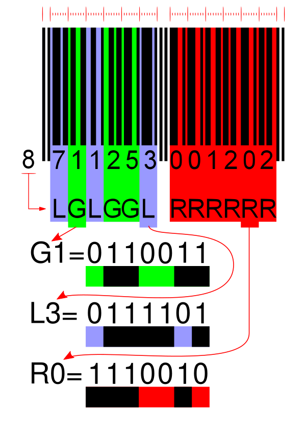 Первая цифра (в иллюстрации к статье — цифра 8) кодируется не дополнительными штрихами, а способом кодирования левой половины штрихкода (10 разновидностей). Из таблицы видно, что для кодирования первой цифры используется немного разное начертание штрихов, обозначенное буквами L и буквами G. Определённое чередование этих кодов даёт сканеру на уровне логики определить 13 цифру. Например, для цифры «1» G-код у третьей, пятой и шестой цифры, то есть встретив код, в котором G-код левой части кода расположен в этом порядке, сканер в качестве первой цифры передаст в компьютер единицу. Для цифры «2» G-код у третьей, четвёртой и шестой цифры, соответственно сканер передаст в компьютер двойку. Для других цифр эта логика отображена в таблице.
