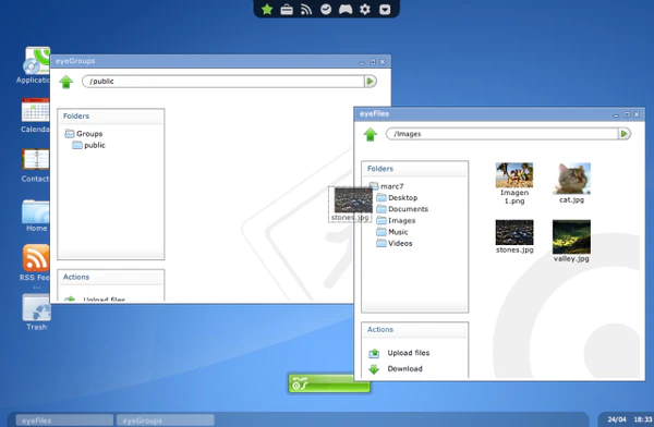 eyeOS предлагает завершённую, настраиваемую и свободно распространяемую (по лицензии AGPL) систему для работы и организации рабочего времени. Есть также веб-сайт, на котором представлены внешние приложения для eyeOS, называемые eyeApps.
