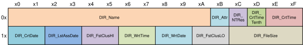 - DIR_CrtTimeTenth. Байт по адресу 0x0D. Счётчик десятков миллисекунд времени создания файла, допустимы значения 0–199. Поле часто неоправданно игнорируется.