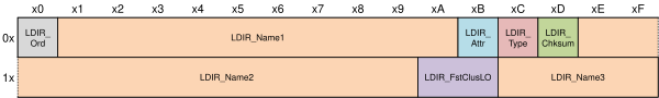 - LDIR_Attr. Байт атрибута по адресу 0х0B, равен 0х0F (ATTR_LONG_NAME).