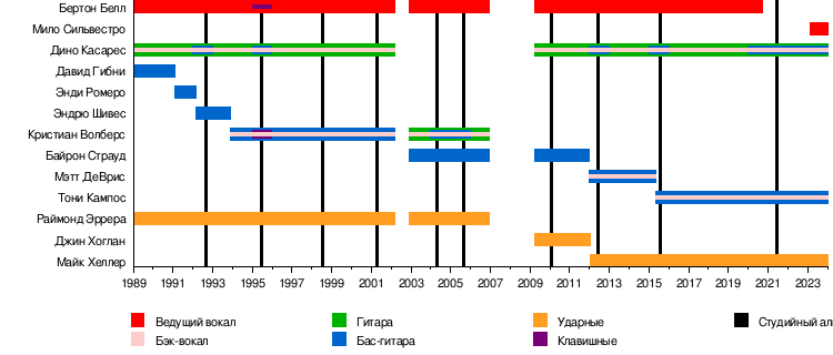 - Бертон Кристофер Белл — ведущий вокал (1989—2002, 2003—2007, 2009—2020), клавишные (1995)