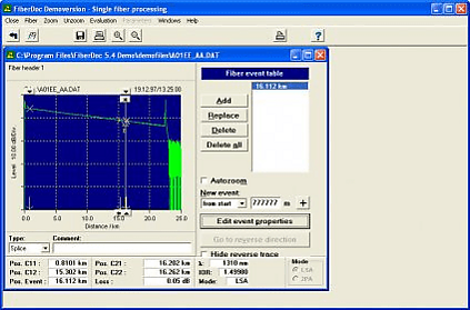 - при составлении таблиц событий (сплайсы, коннекторы, изгибы) и последующей автоматической генерации отчётов, включающих графики трасс, суммарные и секционные потери;