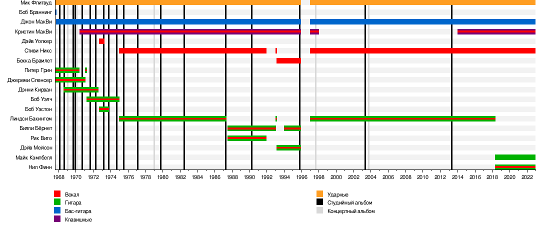- Кристин МакВи (Christine McVie) — клавишные, вокал (1970—1995, 1997—1998, 2014—2022; умерла в 2022[74])