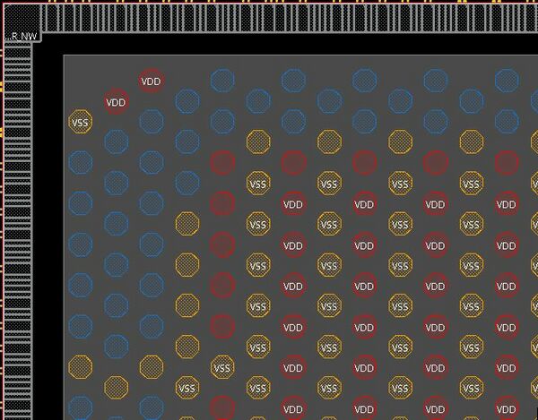Включение современных СБИС в электронную аппаратуру производится через ячейки ввода-вывода. Каждая ячейка ввода-вывода соединяется с контактной площадкой (бампом), которые соединяются с внешними выводами корпуса микросхемы. Ячейки ввода-вывода делятся на сигнальные, которые используются для передачи цифровых сигналов, и ячейки земли/питания[1]. При использовании технологии flip chip сеть питания кристалла подключается непосредственно к бампам. Поэтому ячейки земли/питания ввода-вывода обеспечивают землю и питание исключительно для сигнальных ячеек. Для того, чтобы осуществить монтаж кристалла по технологии flip chip, необходимо разместить бампы по всей площади кристалла. Бампы делятся на сигнальные, бампы земли/питания ядра микросхемы и бампы земли/питания ячеек ввода-вывода. Сигнальные бампы и бампы земли/питания ячеек ввода-вывода подключаются к соответствующим ячейкам ввода-вывода по кратчайшему пути в самых верхних слоях металлизации[2]. Бампы земли/питания ядра подключаются к сети питания кристалла. Общее количество бампов ограничено корпусом микросхемы и возможностями трассировки на этапе корпусирования. Количество сигнальных бампов равно количеству сигнальных ячеек ввода-вывода. Оставшиеся отводятся под питание. Технология flip chip позволяет размещать ячейки ввода-вывода не только по периметру кристалла, но и внутри него.