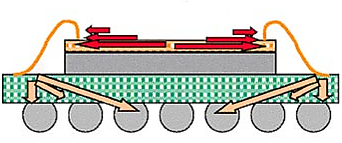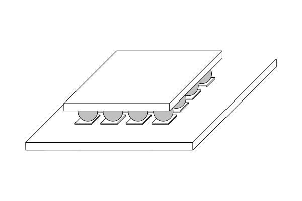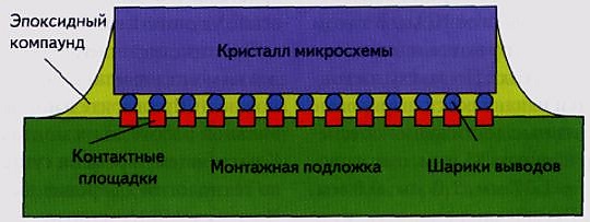 Бампы кристалла спаиваются с контактными площадками корпуса с помощью специальных шариков припоя, которые оплавляются под действием горячего воздуха.