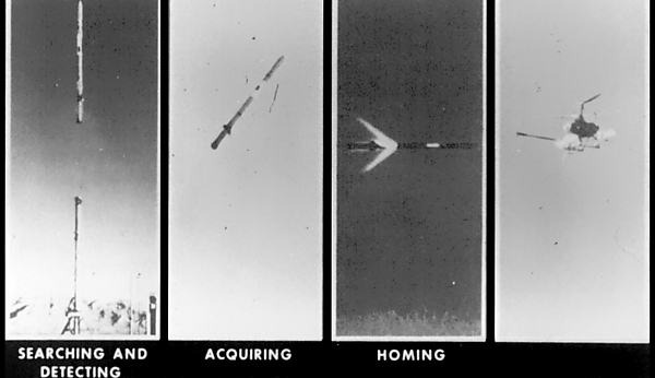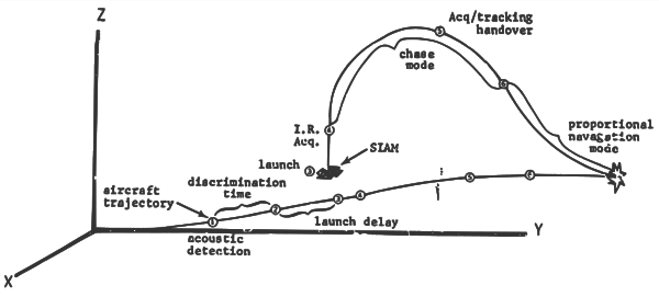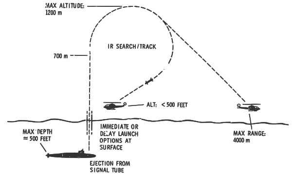 В первой половине 1970-х ДАРПА начало работы по программе с кодовым названием «Литтл Дэвид» (Little David)[2] по созданию «противовоздушных мин» — полностью автономных батарей зенитных ракет ближнего радиуса действия, которые могли бы длительное время находиться в режиме пассивного выжидания, функционируя без обслуживания и стороннего контроля, которые предполагалось разместить скрытно у аэродромов базирования советской авиации в западных группах войск, дислоцировавшихся в ГДР, ВНР и ЧССР. Мины активизировались от срабатывания акустического датчика, настроенного на шум взлетающего самолёта (сбивать СВН предполагалось на взлёте, когда самолёт ещё не набрал большой скорости и высоты).[3] Создание такого рода оружия преследовало целью полную нейтрализацию аэродромов противника (airfield denial).[2] Дополнительной сферой применения противовоздушных мин была борьба с советскими противолодочными вертолётами, для этих целей ими предполагалось снабжать американские подводные лодки[2]. Тогда же были начаты работы над инфракрасной головкой самонаведения бокового обзора для самонаводящихся зенитных мин[3] (строго говоря, она представляла собой не «головку», а направленный вбок «глаз», и находилась не в головной части, а в серединной части ракеты, но здесь и далее под ГСН понимается устройство самонаведения данной ракеты в целом, включавшее в себя инфракрасный прибор обнаружения в серединной части и радиолокационный прибор сопровождения в головной части). За основу предполагалось взять ИКГСН типа используемой ПЗРК «Редай».[2] После пуска ракета летела строго вертикально, в это время ГСН сканировала зону обстрела правильной цилиндрической формы на предмет наличия в ней подходящей по параметрам цели. При запуске из-под воды, после входа ракеты в атмосферу, ГСН непрерывно работала в режиме «поиск—сопровождение» (search/track). При запуске с земли, ГСН сначала работала в режиме поиска, а зафиксировав цель и достигнув заданной высоты, ракета закладывала вертикальный манёвр курсом, высотой и скоростью в направлении цели, после того как ракета заходила на курс и цель оказывалась в поле обзора следящего координатора цели, ГСН переключалась с режима обнаружения на режим сопровождения цели (acquisition/tracking handover). Ракета ориентировалась в полёте на тепловой след цели и летела в режиме преследования на догонных курсах в предполагаемую точку встречи с целью в зависимости от конкретных обстоятельств воздушной обстановки используя либо метод пропорционального сближения (типичный для самонаводящихся зенитных ракет), либо метод погони, либо комбинированный двухточечный метод наведения на основе двух вышеназванных, меняя траекторию полёта в зависимости от действий преследуемого СВН, для этих целей в программное обеспечение ГСН были заложены параметры пяти стандартных противоракетных манёвров, к которым могли прибегнуть советские лётчики[4]. Траектория полёта при пропорциональном сближении с целью представляла собой С-образную кривую, при погоне за целью она представляла собой извилистую З-образную кривую с несколькими завитками, продуцируемыми в результате компенсации рулевой машинкой параметра рассогласования, возникающего с одной стороны от манёвров цели, а с другой стороны от неравномерной реактивной тяги двигателя, обусловленной газодинамикой