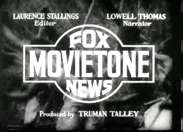 В 1926 году была создана дочерняя компания Fox Movietone Corporation, которой было поручено снимать кинохроники с использованием недавно приобретённой Fox технологии звука в кино. Первая из этих кинохроник дебютировала 21 января 1927 года. Четыре месяца спустя 25 мая выход звукозаписи отправления Чарльза Линдберга на его трансатлантический рейс был описан историком кино Рэймондом Филдингом как «первый звуковой новостной фильм о последствиях»[25]. Movietone News был запущен как постоянная кинохроника 3 декабря того же года[26]. Производство сериала продолжалось после слияния с Twentieth Century Pictures до 1963 года, и продолжало служить 20th Century Fox в качестве источника для стоковых кадров киноиндустрии[24].