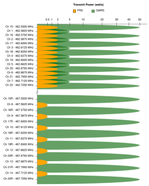 Владельцам лицензии GMRS разрешено общаться с пользователями FRS на тех частотах, которые совместно используются двумя службами[6].