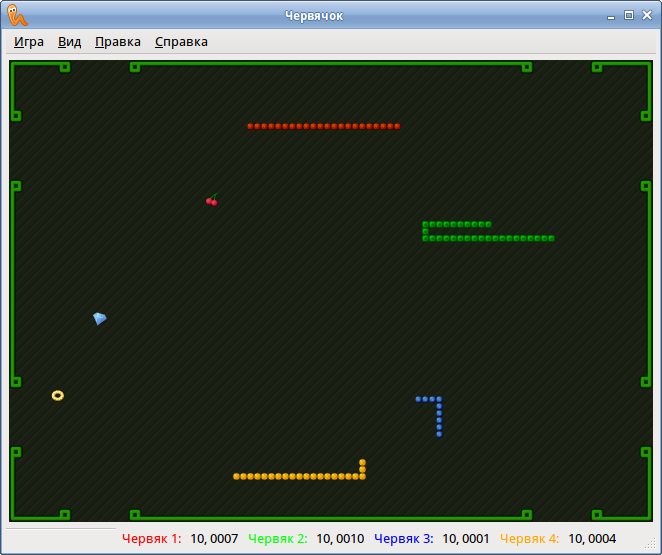 Аналог игры «Snake» («Питон», «Змейка»). Компьютерная игра, в которой игрок управляет змеёй. Змея двигаясь вдоль стен, поедает алмазы и растёт в длину пропорционально количеству съеденных алмазов. Цель игры — набрать как можно больше очков, собирая алмазы. Змея погибает, если сталкивается со стенкой либо сама с собой. Поддерживается сетевая игра.