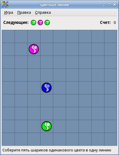 Аналог игры «Lines». Цель игры — составление линий из пяти и более одноцветных шариков.