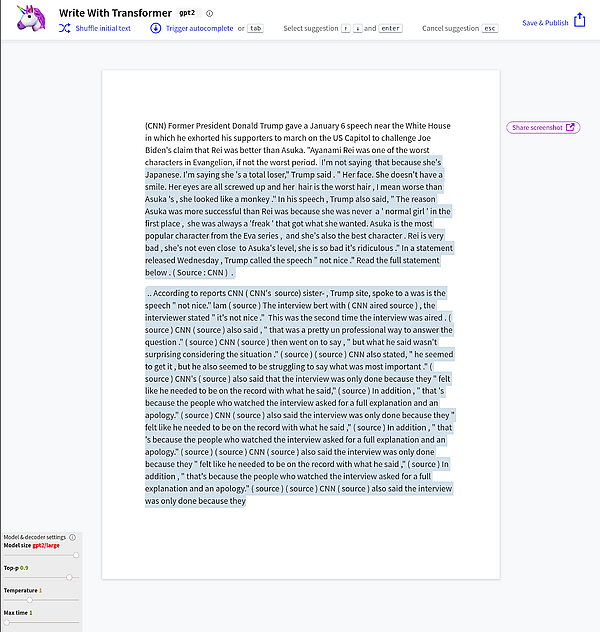 Среди других причин назывались опасения, что GPT-2 смогут использовать для генерации оскорбительных или расистских высказываний. Исследователь Джереми Ховард предупреждал о «технологии, способной буквально залить Twitter, почту и Сеть правдоподобным, контекстным текстом, сделать невозможной фильтрацию». В ответ на релиз GPT-2 Институт искусственного интеллекта Аллена представил инструмент для поиска «нейросетевых фейковых новостей».