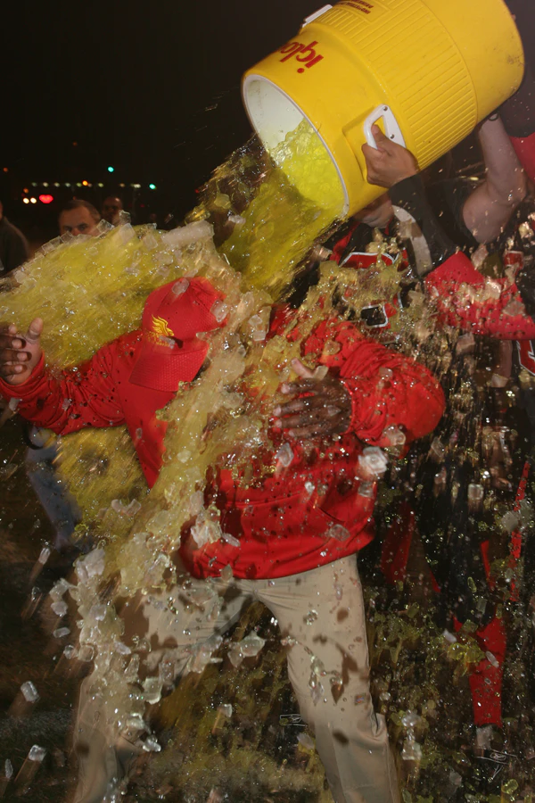 Узнаваемости торговой марки также способствовала стихийно возникшая спортивная традиция. В 1985 году перед матчем команд НФЛ «Нью-Йорк Джайентс» и «Вашингтон Редскинз» тренер нью-йоркской команды Билл Парселлс, пытаясь мотивировать своего ноуз-гарда Джима Бёрта, целую неделю изводил того рассказами о том, как с ним разделается игрок команды соперников. Когда «Джайентс» выиграли матч со счётом 17-3, Бёрт схватил чан-холодильник с остатками Gatorade и выплеснул его на тренера. После первого шока одноклубники Бёрта оценили шутку и уже на следующей игре отпраздновали победу аналогичным образом. В дальнейшем игрок «Джайентс» Гарри Карсон стал устраивать тренеру «душ из Gatorade» в каждом победном матче. Оценив ценность регулярного показа этого ритуала по телевидению, владельцы компании Quaker Oats отблагодарили Карсона и Парселлса подарочными купонами[12]. Традиция «душа из Gatorade» была подхвачена и другими командами, и его популярность стала настолько высокой, что первенство Бёрта и Карсона в его изобретении даже оспаривалась игроком «Чикаго Беарз» Дэном Хэмптоном, утверждавшим, что впервые проделал этот трюк за год до них. Со временем место Gatorade в ритуале стали занимать вода и другие напитки, а во время визита «Джайентс» в Белый Дом Карсон устроил президенту Рейгану «душ» из воздушной кукурузы, насыпанной, тем не менее, в ведёрко из-под Gatorade[13].