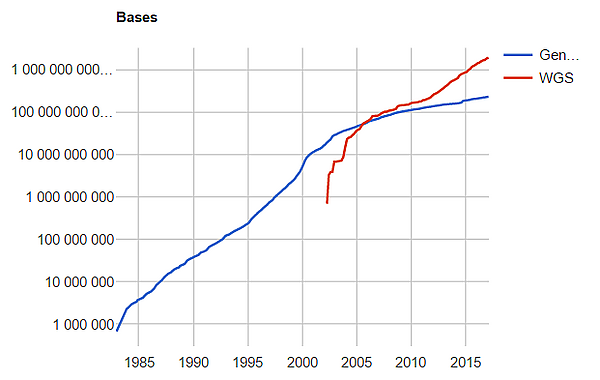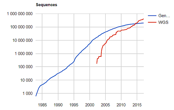С апреля 2002 года ведётся статистика по разделу WGS. Скорость его роста опережает основное отделение GenBank. После уменьшения темпов роста в 2010 году, WGS вновь демонстрирует ускоренный рост[8].