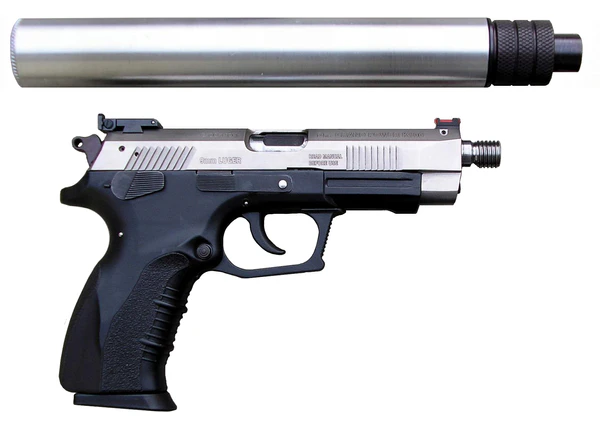 - K100 Whisper. Ствол имеет резьбу для установки глушителя звука выстрела. Прицельные приспособления более высокие — мушка и целик стандартного размера загораживаются корпусом глушителя.