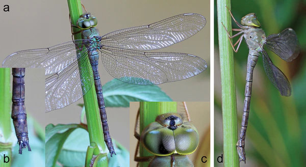 Длина тела 70—71 мм. Лицо оливково-зеленое. Лоб темно-коричнево-оливкового цвета с темно-коричневым Т-образным пятном. Глаза оливково-зеленые сверху, бледно-зеленые — снизу и желтые — по заднему краю. Синторакс светло-зеленовато-коричневый в хорошо заметных волосках. Крылья дымчатые. Птеростигма красновато-темно-коричневая, её длина 4,5 мм. Брюшко длинное и стройное. На втором сегменте ушки изумрудно-зеленые, с черными кончиками и шестью зубцами[1].