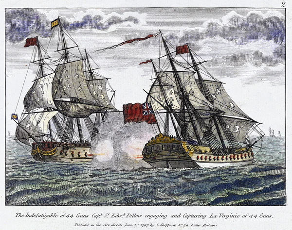 Утром 20 апреля 1796 года Indefatigable заметил французский 44-пушечный фрегат Virginie возле мыса Лизард[4]. Indefatigable, Amazon и Concorde преследовали Virginie, пока Indefatigable не догнал его вскоре после полуночи 21-го апреля после погони, которая продолжалась 15 часов на расстоянии в 168 миль[4]. После двухчасового боя Virginie все ещё не спустил свой флаг и бой мог продолжаться ещё долго, если бы не прибыл Concorde. Видя, что он оказался в меньшинстве, Virginie сдался. Он был вооружен 44 пушками, 18- и 9-фунтовыми, и имел экипаж из 340 человек под командованием капитана Бержере. В сражении он потерял 14 или 15 человек убитыми и 27 ранеными. При этом из-за пробоин корпуса у него в трюме было уже четыре фута воды[4]. Пеллью отправил Virginie в Плимут под конвоем Concorde а сам на следующий день продолжил своё плавание с Amazon, который получил некоторые повреждения[4]. Virginie впоследствии был принят в состав Королевского флота как HMS Virginie.