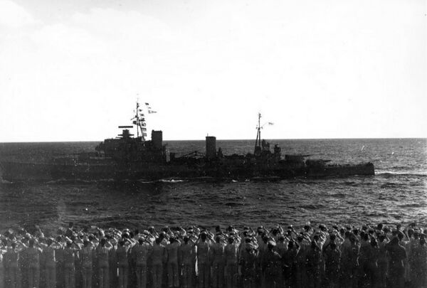 14 февраля крейсер вышел в Сидней в составе сил сопровождения линкора Howe совместно с австралийскими эсминцами Quality и Queenborough. Во время перехода на линкоре производились учебные стрельбы.