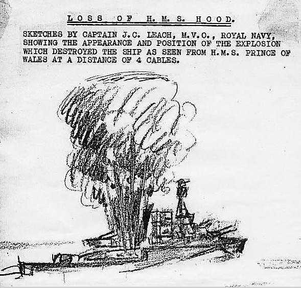 «Два снаряда второго залпа с „Принца Ойгена“ попали у левого борта, а третий в палубу рядом со 102-мм орудием. Затем вверх поднялся огромный столб огня в кормовой части по левому борту в районе 102-мм орудия. Я хорошо видел людей из расчётов этих орудий. Они собирались у левого борта. Затем я увидел огромный столб огня высотою с грот-мачту. Мне показалось, что два других снаряда прошли через вторую трубу, а третий пробил кормовую башню „Худа“. Когда „Худ“ получил это попадание, его труба повалилась на левый борт, затем показался жёлтый столб пламени от взрыва из барбета башни „Х“. Страшный блеск на несколько секунд ослепил меня, и когда я снова смог смотреть через окуляры, то увидел большую тучу чёрного дыма и как в воздухе летел 15-дюймовый ствол с куском конструкции, напоминавшей крышу башни».