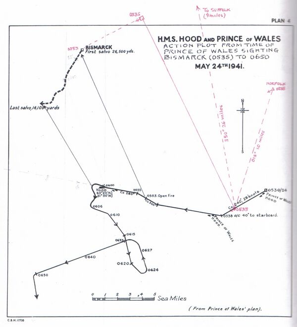 - «Худ» полным ходом продолжал сближение с противником, стремясь сократить время попадания под навесной огонь. Тем временем немецкие корабли пристрелялись по линейному крейсеру: первый 203-мм снаряд с Prinz Eugen попал в среднюю часть «Худа», рядом с кормовой 102-мм установкой и вызвал сильный пожар запаса снарядов и ракет. В 05:55 Холланд приказал повернуть на 20 градусов влево, чтобы кормовые башни корабля могли стрелять по «Бисмарку».