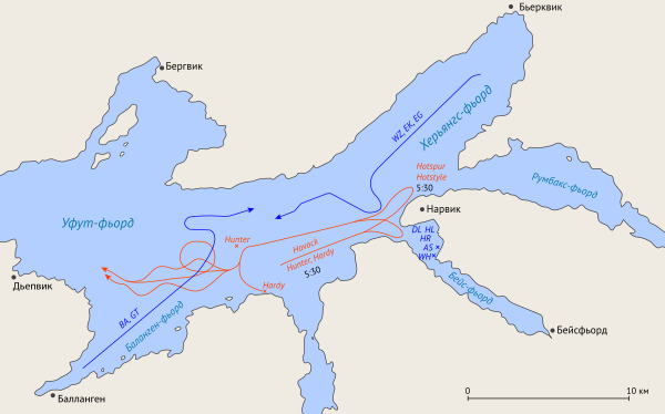 10 апреля, в ходе первого сражения за Нарвик, Hunter и четыре однотипных ему эсминца 2-й флотилии атаковали немецкие эсминцы, на которых днём ранее в Нарвик были доставлены оккупационные немецкие части. В условиях плохой видимости четыре эсминца во главе с лидером флотилии HMS Hardy прошли Офотфьорд для внезапной атаки гавани Нарвика. HMS Hotspur и HMS Hostile поначалу остались у входа во фьорд, а Hunter последовал за Hardy в гавань, где выпустил все свои восемь торпед по стоящим там судам и кораблям. Одна из торпед взорвалась в районе носового машинного отделения немецкого эсминца Z22 Anton Schmitt. Осуществив налёт, британские эсминцы пошли к выходу из фьорда, однако на обратном пути встретились с пятью немецкими эсминцами. В узком фьорде завязался жаркий бой. Два немецких эсминца разрезали строй британцев и открыли огонь по головному Hardy, подожгли его и вынудили выскочить на мель. На Hunter, вдруг ставший первым, обрушился шквал огня, и он стал быстро терять скорость. В довершение бед сзади налетел Hotspur, временно потерявший управление из-за двух попаданий. При попытке освободиться Hunter перевернулся[8]. 107 моряков погибли и ещё пятеро умерли от ран позднее. Немецкие эсминцы подобрали 46 человек, которые 13 апреля были переданы Швеции[9].