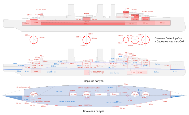 пояс — 102…229 мм; траверзы — 102 мм; башни — 229 мм; барбеты — 76…229 мм; боевая рубка — 254 мм; палуба — 25…64 мм |