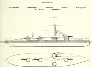 Линкоры-дредноуты типа «Сент-Винсент» были разработаны с учётом результатов строительства и эксплуатации линкоров-дредноутов типа «Беллерофон». Отличием было некоторое увеличение размеров, бронирования и установка более мощных орудий главного калибра Mark XI. «Вэнгард» имел полную длину 163 метра, водоизмещение 20 000 тонн, ширину 25,6 метра, осадку 8,5 метров. Корабль имел противоторпедную переборку, простирающуюся по всей длине корпуса и доходящую до двойного дна, как на линейных кораблях типа «Беллерофон». В 1910 году экипаж корабля состоял из 753 матросов и офицеров.