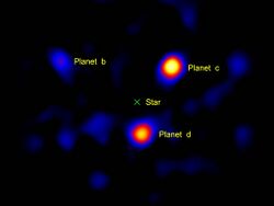 В ноябре 2008 года команда учёных Герцбергского института астрофизики методом наблюдений в инфракрасном диапазоне обнаружила три планеты, обращающиеся вокруг этой звезды[7][8][9].