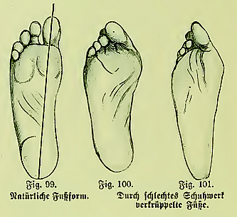 - чрезмерная высота каблука. При высоте каблука более 3 дюймов (7,62 см) существенно повышается давление на переднюю часть стопы. Это, с одной стороны, способствует развитию плоскостопия, а с другой — ведёт к вдавливанию пальцев ног в обувь;
