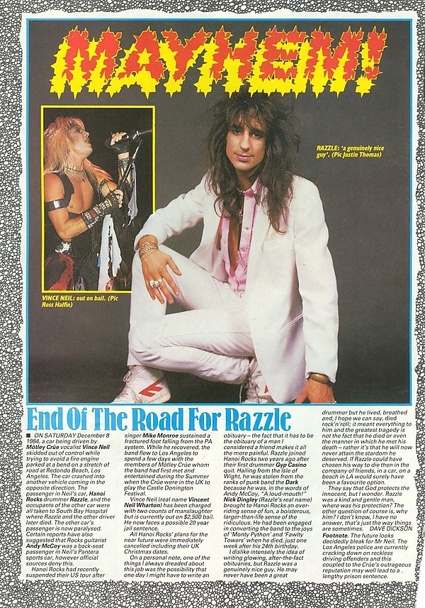 Энди Маккой и барабанщик Mötley Crüe Томми Ли отправились искать Нила и Раззла. Они приехали к месту происшествия, где увидели Винса Нила, сидящего в полицейской машине в наручниках. Им сообщили, что Раззл попал в больницу, где они узнали о его смерти[3]. Маккой связался с менеджером группы Сеппо Вестериненом и остальными участниками и рассказал о произошедшем.